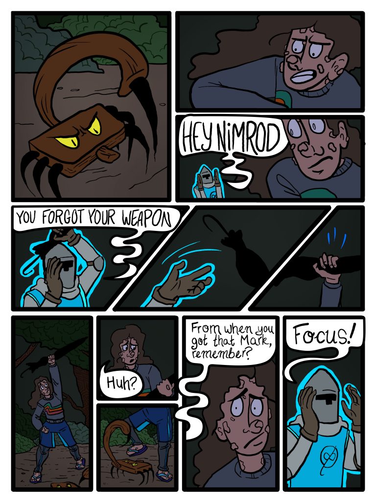 It’s frustrating because when I draw these pages I have a lot to say about them but then I am posting them months later and I don’t have much to say… I hope the knight’s semi-cursive dialogue isn’t too illegible.