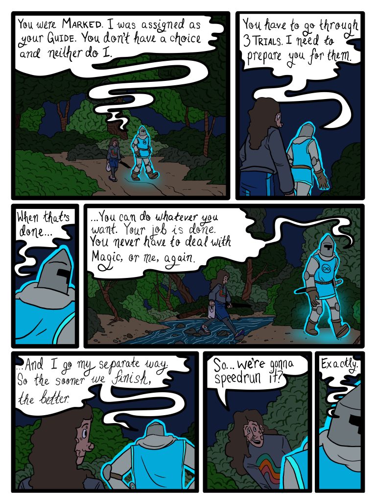 2.31 Exactly by blisterfish on April 1, 2022 at 8:00 am Chapter: 2— Knight in Glowing Armor That fourth panel is pretty awesome if I so say so myself. I still struggle with interesting environments. Comment