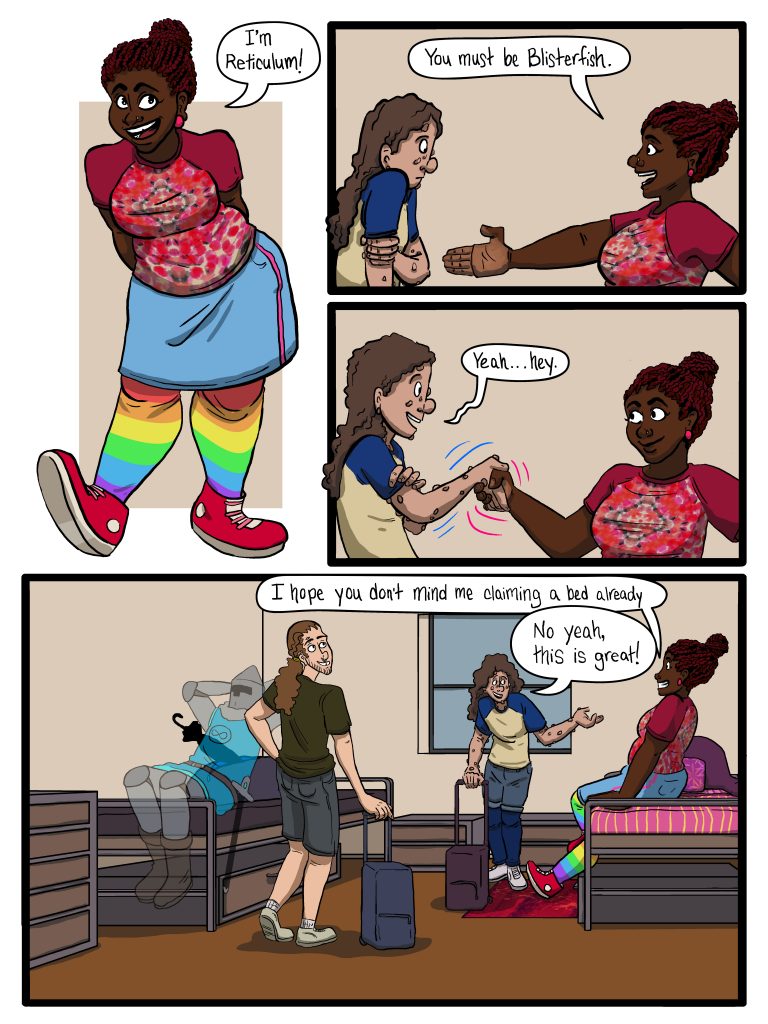 Hello. Sorry for the unannounced hiatus. My name’s Graham; I’m a friend of Kay’s. They won’t be able to post the rest of this chapter, but they did finish drawing it. So I’ll be posting it, with one page going[…]↓ Read the rest of this entry…