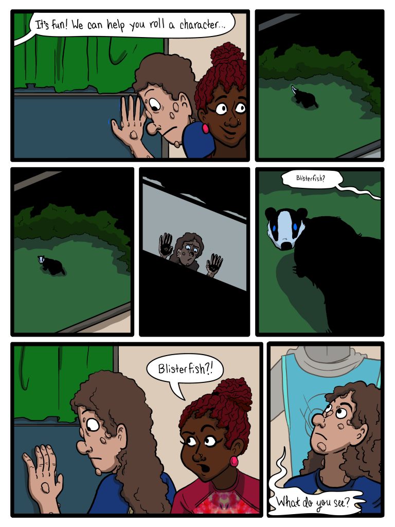 3.23 What Do You See by blisterfish on May 19, 2023 at 10:10 pm Chapter: 3— Face-Off On Campus I don’t know what the heck that is, man. Looks like some kind of messed-up dog. Comment