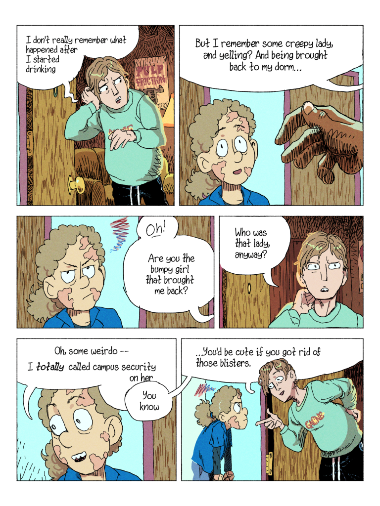 4.2 The Bumpy Girl by blisterfish on December 20, 2024 at 9:27 am Chapter: 4— The God of Righteous Anger I was really proud of that hand in the second panel. Comment