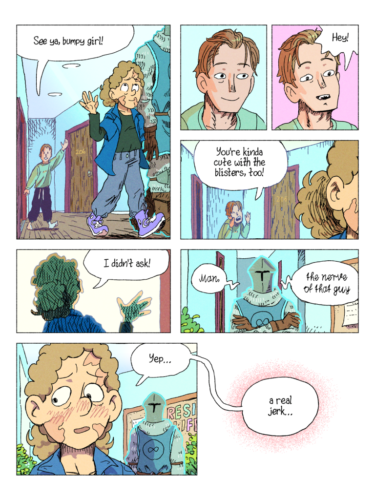 4.4 A Real Jerk by blisterfish on January 3, 2025 at 7:58 am Chapter: 4— The God of Righteous Anger Happy New Year from your favorite dermatologically-challenged teen and spectral guardian! Comment